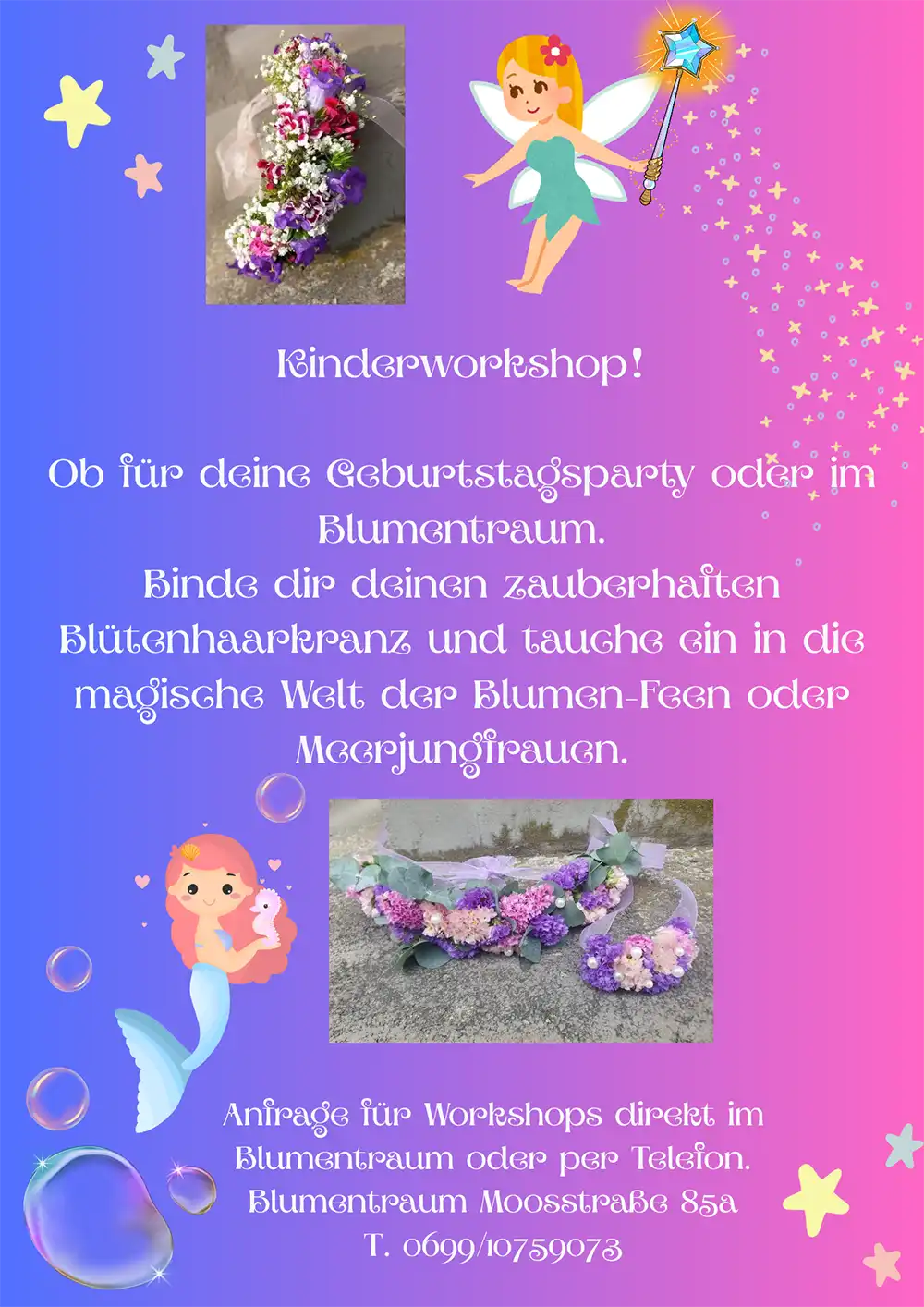 Blumen inspirieren, verbinden und laden dazu ein, selbst kreativ zu werden. In meinen Workshops bei Blumentraum in Salzburg haben Sie die Möglichkeit, die faszinierende Welt der Floristik hautnah zu erleben. Ob Blumenhaarkränze, kleine Gestecke oder kreative Arrangements – gemeinsam gestalten wir mit Blüten, Blättern und Naturmaterialien ganz persönliche Werke. Jeder Workshop ist ein Erlebnis voller Freude, Fantasie und natürlicher Schönheit.